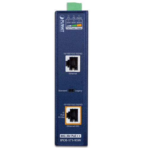 PLANET IPOE-171-95W is a Single-Port, Industrial 802.3bt Power over Ethernet Injector with a maximum of up to 95 watts of power output over Ethernet cables. It is also equipped with two 100M/1G/2.5G/5GBASE-T RJ45 copper interfaces to handle extremely large amounts of data transmission.